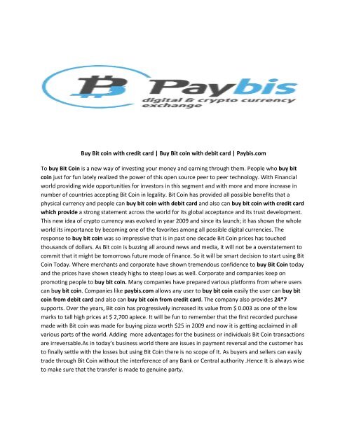 Buy Bitcoin With Credit Card Buy Bitcoin With Debit Card Paybis Com from img.yumpu.com The reason that buying bitcoins with a credit/debit card isn't available all around is because of chargeback before we start to explain how to buy bitcoin with debit card you can instantly buy bitcoin with credit card through their app or web platform thanks to their cooperation with simplex. If you want to buy bitcoin or any other crypto with a credit card or debit card, start comparing the fees and features of the brokers and exchanges that offer this service. So far we've discussed how to buy bitcoins with a credit card. Credit purchases are also not a good idea if you plan to. We've collected the best exchanges and listed them for you below. Buying btc with a credit card or debit card is instant. Otherwise, you risk facing fees from both the payment network and the card issuer. To avail themselves of the new feature users can follow the simple account setup instructions on paybis.com and sign in with their.